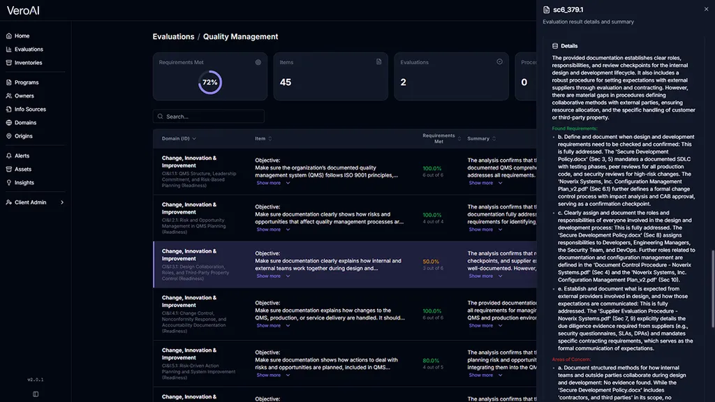 The platform applies audit and regulatory logic through evidence evaluation across policies, records, and operational data to produce structured findings. It supports audit teams in reviewing evidence, executing testing procedures, and generating documentation for audit and regulatory use. Learn more about Vero AI’s AI for auditing platform.