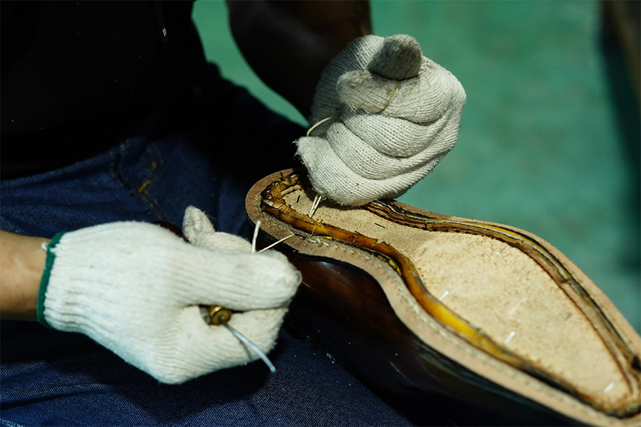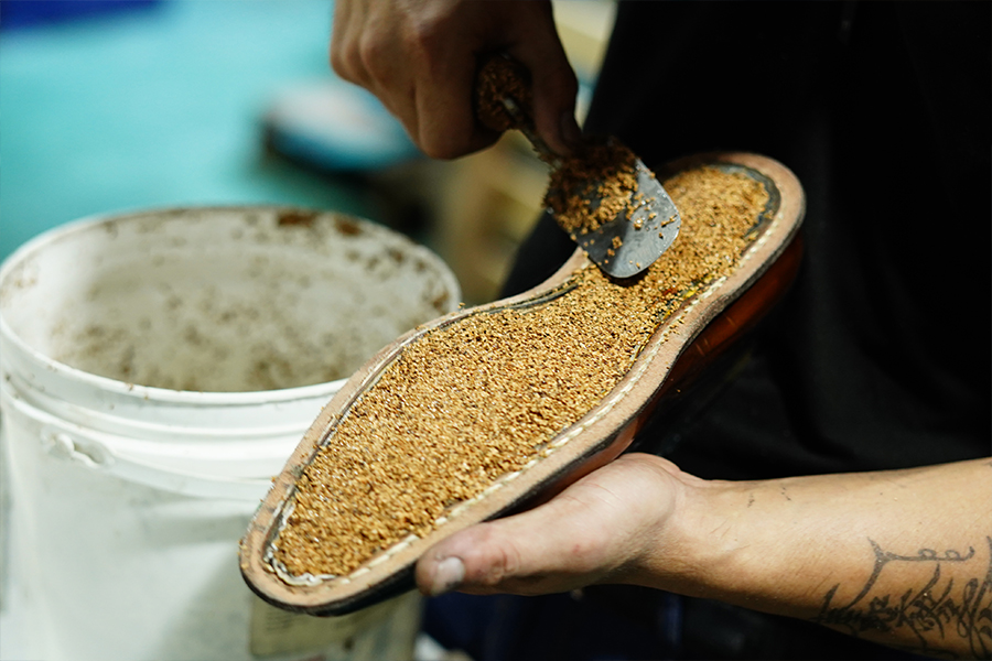The functional advantages of 360° channeling go far beyond appearance. Because the welt is stitched directly into the leather insole, the shoe benefits from improved stability and a more seamless internal structure. Underfoot, the cork-filled cavity molds more precisely to the user’s foot, providing a custom fit and superior comfort over time. The thicker insole also shortens the break-in period while enhancing foot support, making the shoes more comfortable for long wear. The absence of a traditional heel seat piece allows the upper to maintain its shape better during resoling, giving the shoe a significantly longer lifespan. This construction method aligns with the expectations of discerning customers who value longevity and refined craftsmanship. While most factories rely on speed-oriented Goodyear processes, very few possess the capability to execute full insole channeling—let alone at scale—making this technique a rare combination of artisanal finesse and industrial precision.