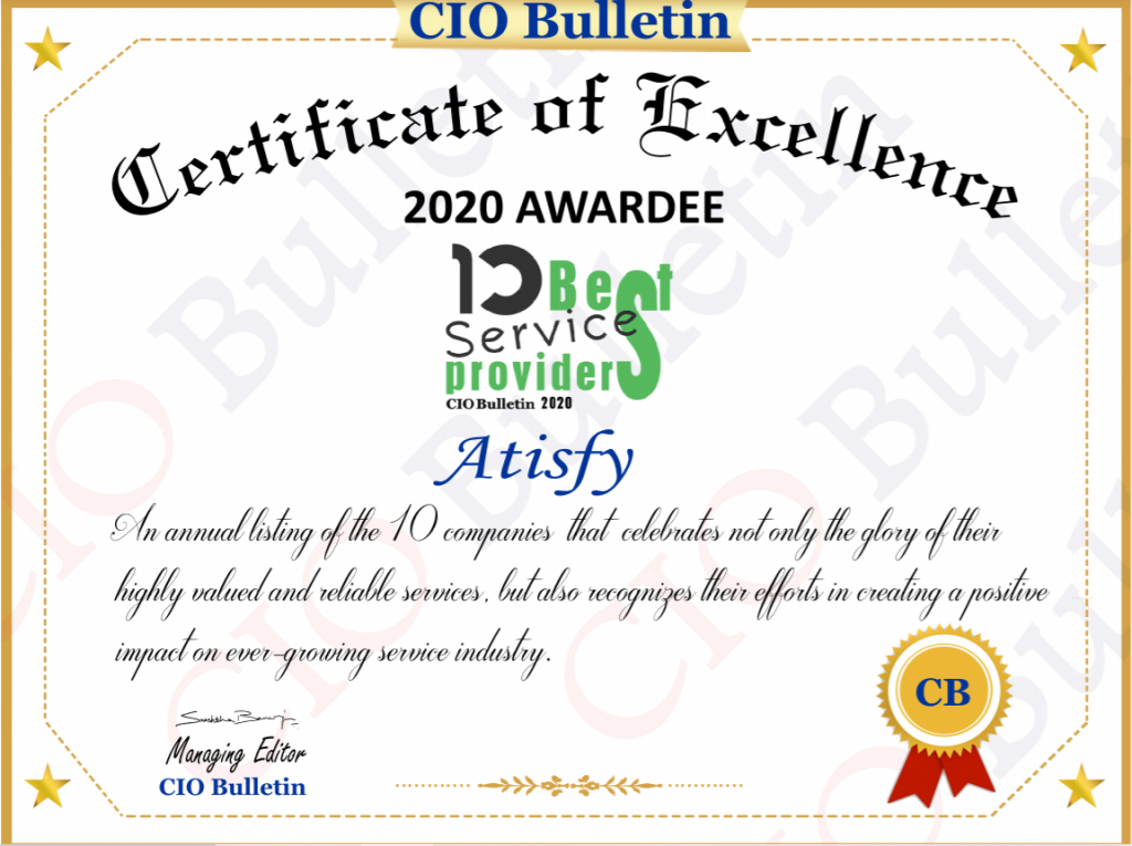 The CIO Bulletin’s ‘10 Best Service Providers 2020’ annual list identifies and celebrates highly valued and reliable service providers, recognizing their efforts in creating a positive impact on ever-growing service industry. atisfy has been selected based on their industry dominating services, brand reputation in the global market, openness to innovation, domain influence, and ability to understand the market and its customers at a deeper level.