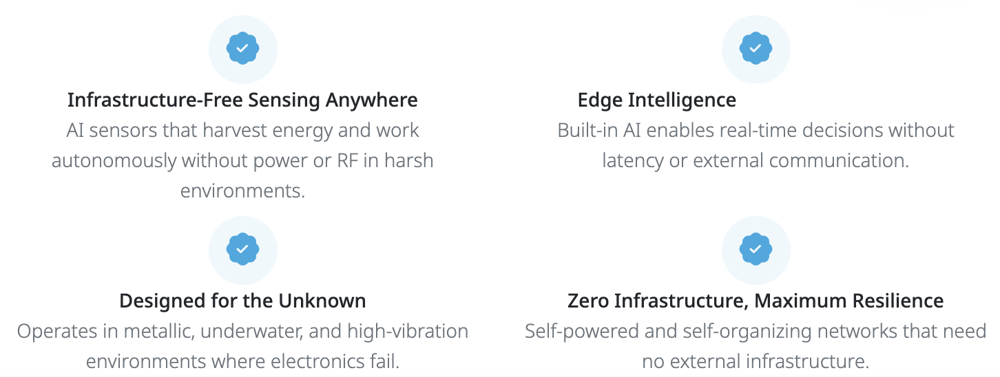 - Self-powered and self-organizing — no pairing, calibration, or infrastructure