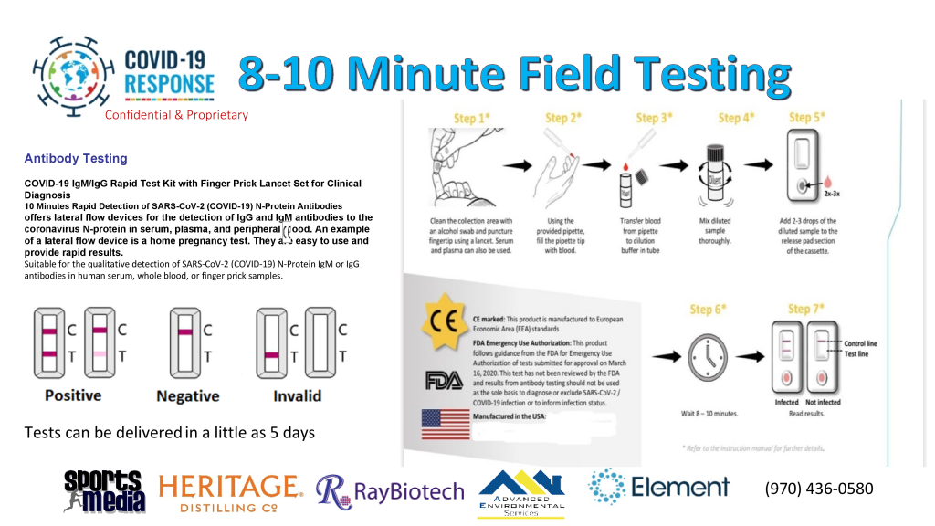 Friday June 5th, 2020 Re-Open America will make 20 milion Rapid Covid-19 test available by visiting www.reopen-america.net. Re-Open America is an initiative lead by 4 companies seeking to assist the nation in reopening under safe conditions. Sports Media Inc, RayBiotech, Heritage Distillery, & Advanced Environmental Services have all partnered to package their services to create a more affordable reopening process. Leading this initiative is Ivan Cloyd, Regional Vice-President at Sports Media Inc. and former Affordable Care Act Program Manager under DC Healthlink and the Obama Administration.