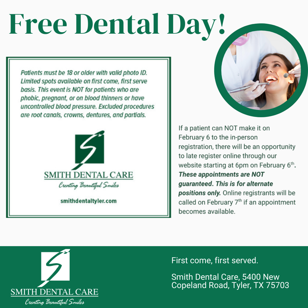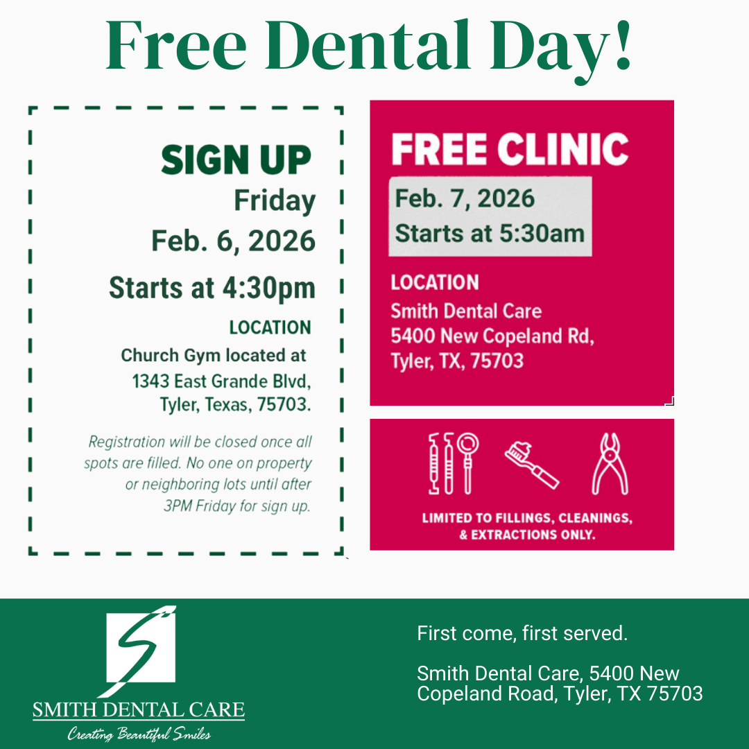 Patients are encouraged to review full event details and eligibility information on the Free Dental Services Day page prior to registering. For more information about the 2026 Free Dental Day or to learn how to register, visit: https://www.smithdentaltyler.com/free-dental-day/.