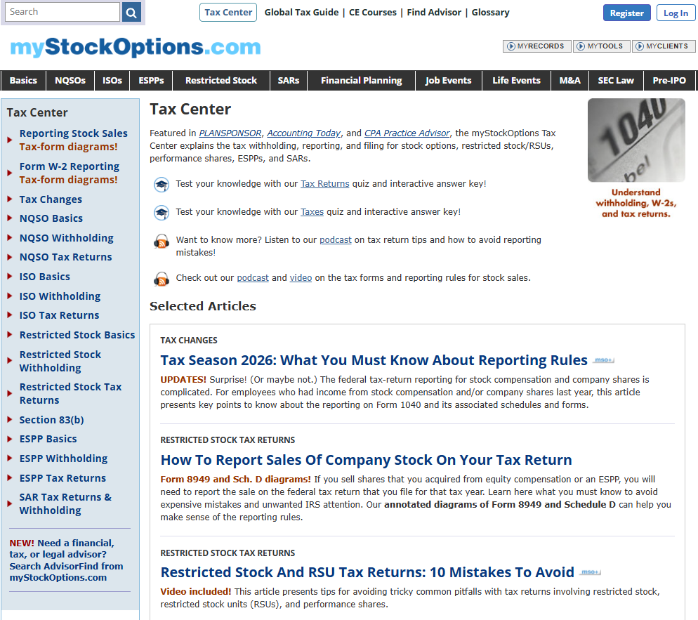 The 2026 tax-filing season presents more risk than ever for costly blunders on tax returns among the millions of US employees who have equity compensation and company shares. The fully updated myStockOptions Tax Center is a key resource for employees with equity compensation. It provides expert yet easily understandable guidance on tax returns that involve stock options, restricted stock, restricted stock units, performance shares, stock appreciation rights, employee stock purchase plans, and sales of company stock.