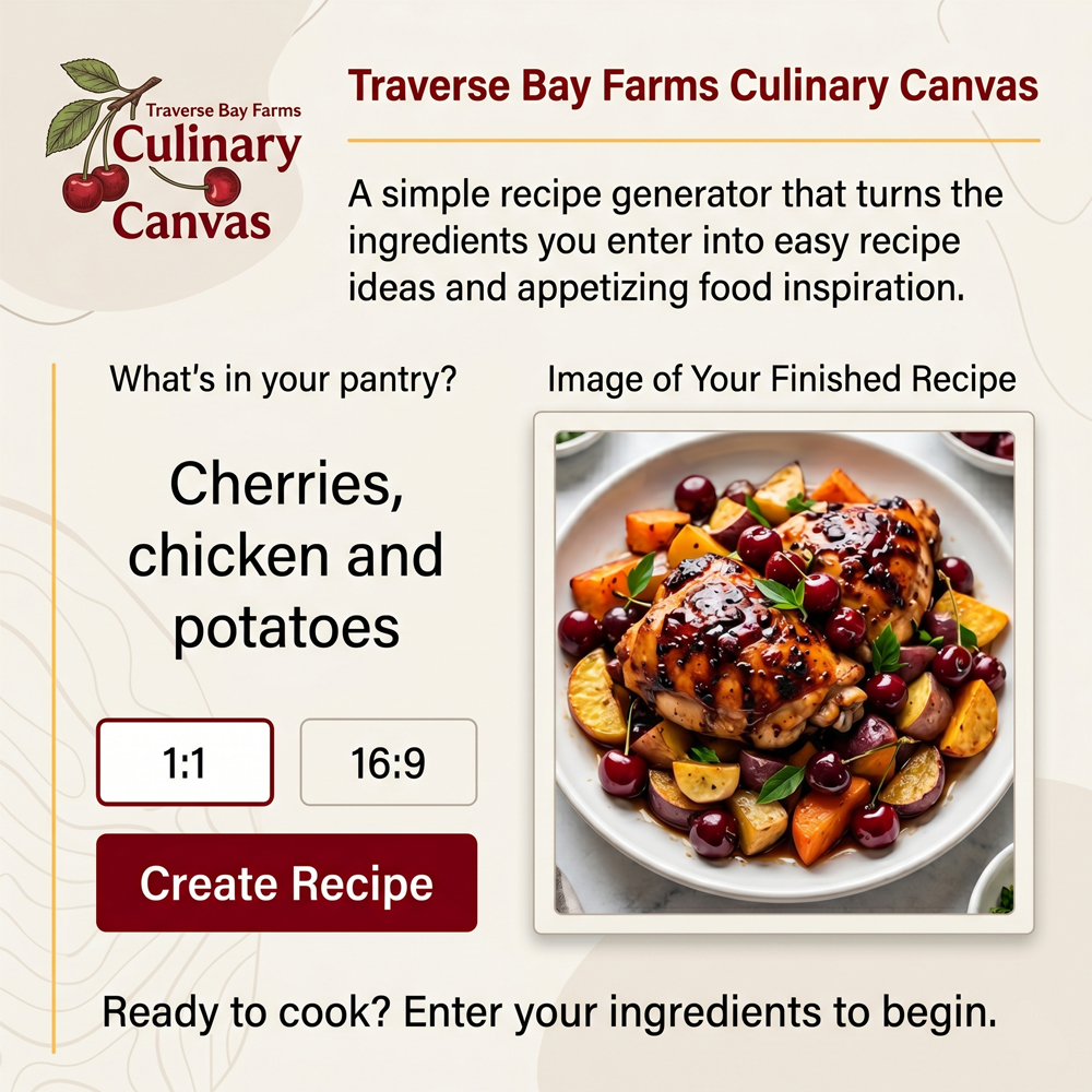 Traverse Bay Farms Culinary Canvas gives users a fast way to enter ingredients already in their pantry — such as eggs, flour, spinach, or tomatoes — and receive recipe inspiration that is simple, useful, and easy to follow. The tool is designed for home cooks who want fresh ideas without spending extra time searching through multiple websites or complicated recipe platforms.